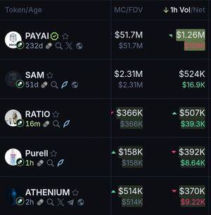 Nejlepší Pumpfun mince za poslední 1 hodinu podle objemu: $Payai $Sam $Ratio $Purell $Athenium