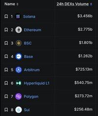 🚨 Solana 完全主導 24 小時 DEX 交易量 🔥: • 2× BSC • 3× Base • 6× Hyperliquid • 14× Sui • 26× Monad • 600× Cardano